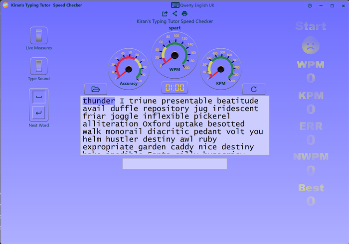 It provides discreet, independent, and moderately difficult words to measure the worst case scenario or your lowest speed; if you want, you can load your own text by clicking the Open button